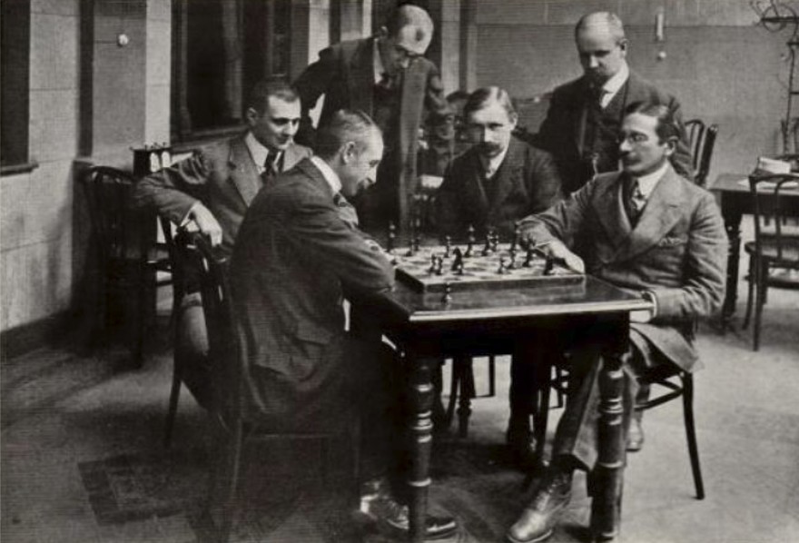 Сидят, слева направо: Нимцович, д-р Алехин, Грюнфельд, д-р Тарраш, Михель, городской советник Тис, д-р Видмар и Рубинштейн.