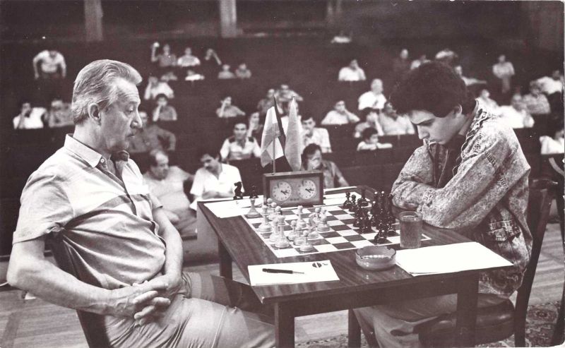Ереван, май–июнь 1989 года. Мемориальный турнир Петросяна. Ветеран-гроссмейстер Светозар Глигорич (Югославия) играет против Владимира Акопяна (СССР).