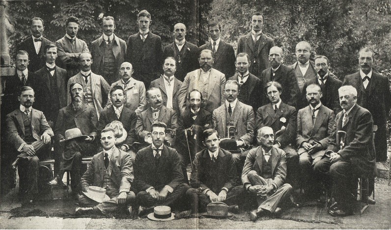 | Марафонский турнир в Карлсбаде, стартовавший в августе того же 1911 года, стал для Тартаковера (стоит крайний слева у колонны) первым по возвращении из Ростова. Кстати, уж не в России ли он отпустил усы?.. Фото из журнала «Wiener Schachzeitung» (№ 17/20, 1911). |