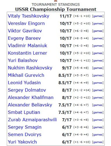 Сегодня, 40 лет назад, в Киеве стартовал финал 53-го чемпионата СССР. Он продолжался до 28 апреля 1986 года. Итоговая турнирная таблица приведена ниже. Чернобыльская катастрофа произошла 26 апреля 1986 года, всего в 100 км от Киева... |