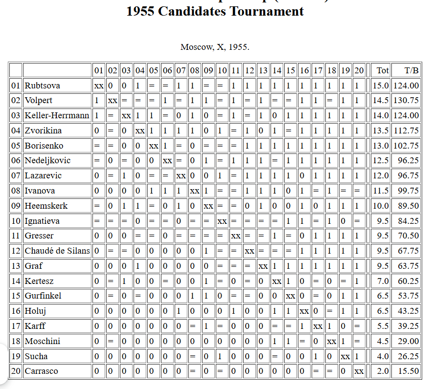 | Ольга Рубцова выиграла женский турнир претенденток ФИДЕ 1955 года, опередив Ларису Вольперт в последнем туре. Её дочь, Елена Фаталибекова, выиграла межзональный турнир в Тбилиси в 1976 году. Ольга стала чемпионкой мира, победив Быкову и Руденко в трёхстороннем матче. Елена проиграла полуфинал Алле Кушнир. |