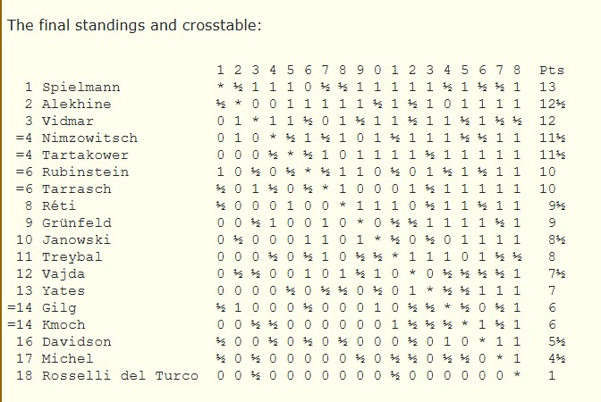 Школа гипермодернистов была хорошо представлена: в первой половине турнира лидировали Нимцович и Тартаковер. Однако к концу соревнования серия ошибок и неожиданных результатов привела к смене лидера, и в итоге победителем стал великий романтик Рудольф Шпильман, обойдя Алехина после последнего тура. Этот турнир стал лучшим выступлением Шпильмана за всю его шахматную карьеру. |