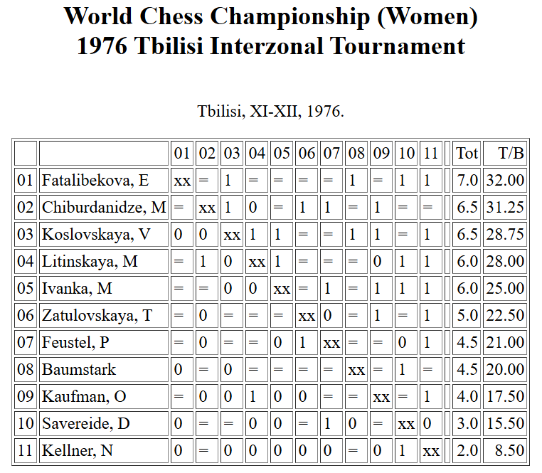 50 лет назад, в 1976 году — дни межзональных турниров и матчей претендентов. Ван дер Мийе победила Белавенец в первом раунде. |