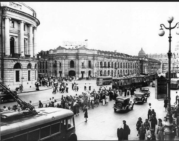 Очевидно, Невский, Гостиный двор. Выглядит, мягко говоря, не слишком хорошо. Троллейбусы по Невскому ходят с начала 30-х, но на переднем плане газ М1, они выпускаются с конца 30-х