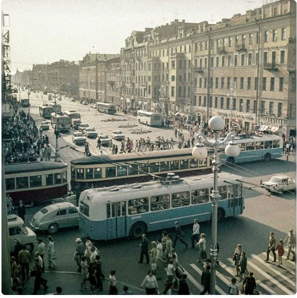 Кто-нибудь помнит такие трамваи? Это видимо, 50-е годы. Ленинград, на пересечении Невского и Садовой, у Гостиного двора. |