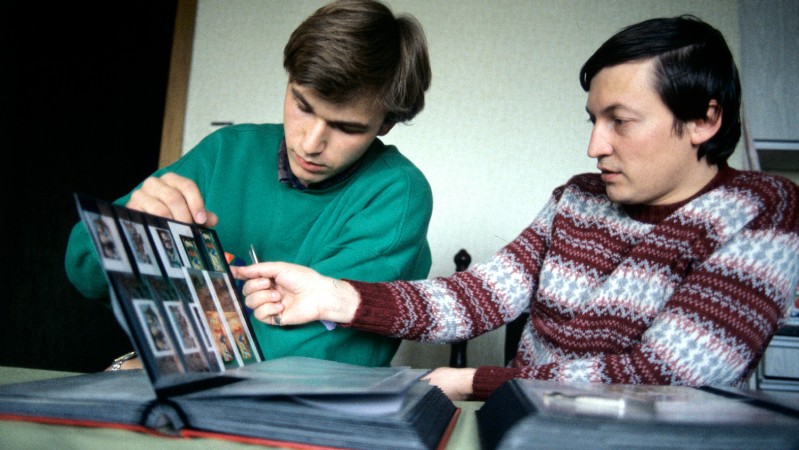 На фото: Анатолий Карпов и Андрей Чесноков за просмотром альбома с марками