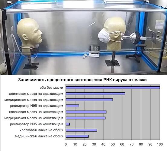 Группа ученых Токийского университета решила проверить эффективность рекомендации ВОЗ по ношению масок. С японской дотошностью они заправили "кашляющий" манекен слюной с вирусом и подобрали заданное соотношение размера капелек. "Вдыхающий" манекен подключили к аппарату ИВЛ и с помощью ПЦР с обратной транскрипцией в реальном времени контролировали количество "вдыхаемых" вирусных РНК.
