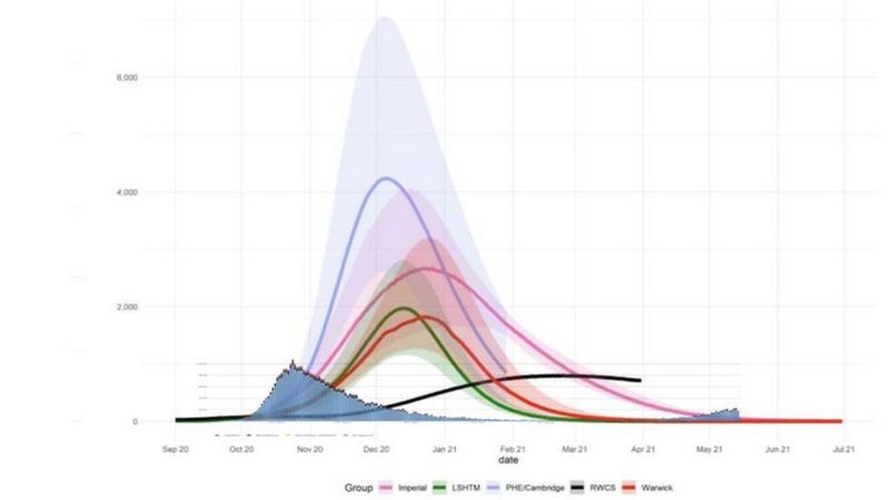 BBC публикует сводную модель с прогнозами от разных групп экспертов (на фото) из презентации государственной группы по моделированию пандемии SPI-M-O. Ковид распространяется по Англии значительно быстрее, чем предполагал самый пессимистичный сценарий правительства.