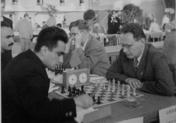 Николай Минев играет с Михаилом Ботвинником на шахматной олимпиаде 1954 года в Амстердаме.