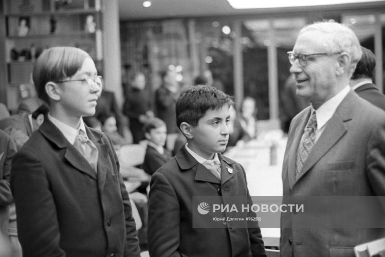 | Главный орбитр турнира, гроссмейстер Михаил Ботвинник с участниками Всесоюзного шахматного турнира команд Дворцов пионеров, посвященного 50-летию образования Всероссийской пионерской организации и 50-летию образования СССР. |