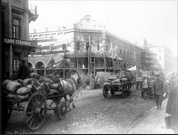 Ленинград 1927 год. Строительство Кузнечного рынка. В доме слева открыли в 1971 музей Ф.М.Достоевского – Кузнечный переулок дом 5. Писатель снимал здесь квартиру короткое время в 1846 году, а в 1878 году переехал в этот дом с семьей и жил в нем до своей смерти в 1881 году. Здесь был написан роман “Братья Карамазовы”