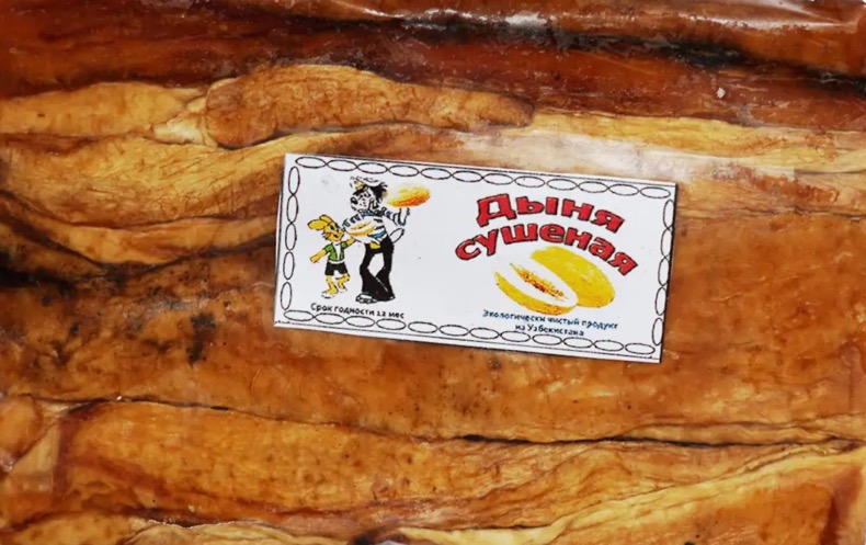 Они были в заводской целлофановой упаковке размером примерно 2х5х10 см. Сейчас я понял, что это скорее всего были сушенные спресованные полоски дыни, только неосветленные сульфитами. Более темные, чем эти: