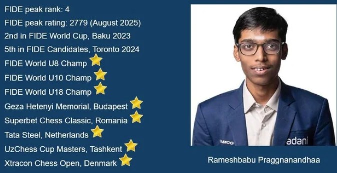 Индия стала одной из ведущих сил в международных шахматах благодаря своему сильнейшему игроку — Рамешбабу Праганнанде. Он занимает 4-е место в мире, на одну позицию выше своих соотечественников — Гукеша Доммараджу, действующего чемпиона мира, и Арджуны Эригайси, которые делят 5-ю строчку.