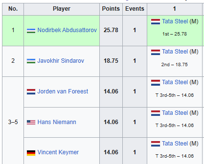 Почитатель: Из 10-ти участников Masters шестеро (!) принимали участие в главном "Вейке" и по его итогам четверо (вместе с Синдаровым) возглавили гонку FIDE Circuit