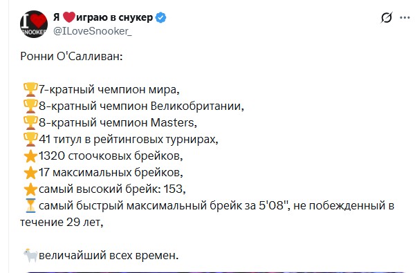 Якобы "случайный" чемпион мира Чжао Синьтун (к нему относились примерно так же, как к Гукешу) рвет и мечет. Чуть-чуть не хватило, чтобы в чемпионате Тура он под ноль разгромил легендарного Джона Хиггинса, но и так 10-1 производит впечатление. Сегодня финал против также находящегося в отличной форме Джадда Трампа. Это будет зрелище!