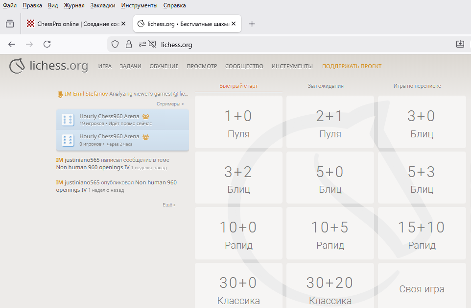 Все эти кнопки 1+0, 3+2, 5+0 и т.д. - относятся к ортодоксальным шахматам. Где же здесь быстрый (без кучи дополнительных настроек) пэйринг для шахмат Фишера?
