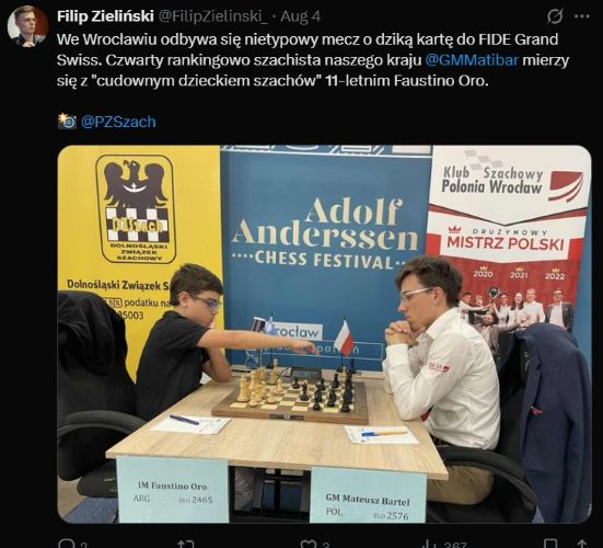 Матч Фаустино Оро и Матеуша Бартеля определит путёвку в турнир «Wild Card» на Grand Swiss Chess 2025. Матч будет проходить по той же схеме, что и матч Пранава Венкатеша против Казыбека Ногербека, отборочного турнира Grand Swiss.