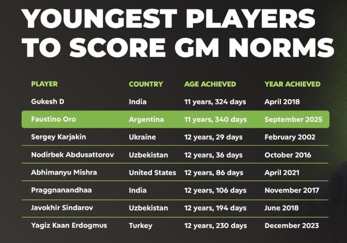 11-летний аргентинский шахматист Фаустино Оро выполнил свою первую норму гроссмейстера. В более юном возрасте это удавалось сделать только Гукешу Доммараджу.