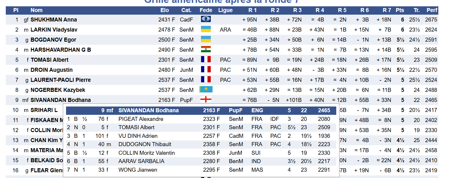 Sivanandan won again in round seven (of nine) on Friday evening to take her score to 5/7. She now shares fifth place in the 110-player Cannes Open, just one point behind two joint leaders, one of whom is another young woman, Russia's Anna Shukhman, 16.