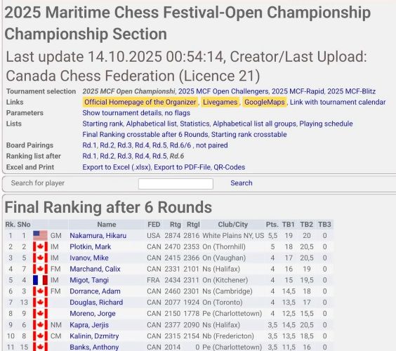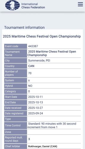 Турнир The Maritime Chess Open не был зарегистрирован за 30 дней до его начала.