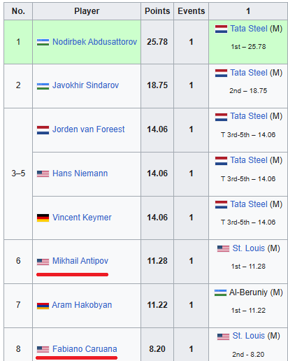 У Hikaru Nakamura оттуда было 6 рейтинговых партий, которые учитывались в борьбе за место в Турнире претендентов. |