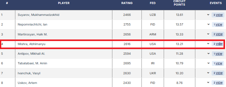 В общем зачете "циркуита" победитель рапид-круговика на Менорке Нихал Сарин вошел в Топ-10 (и тоже - 13 очков с копейками). Изменения последуют совсем скоро - после завершения ТП.