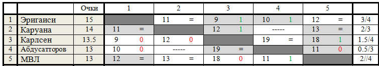Ниже - табличка этого мини-турнира, с указанием номера тура (заодно помечен и цвет фигур)