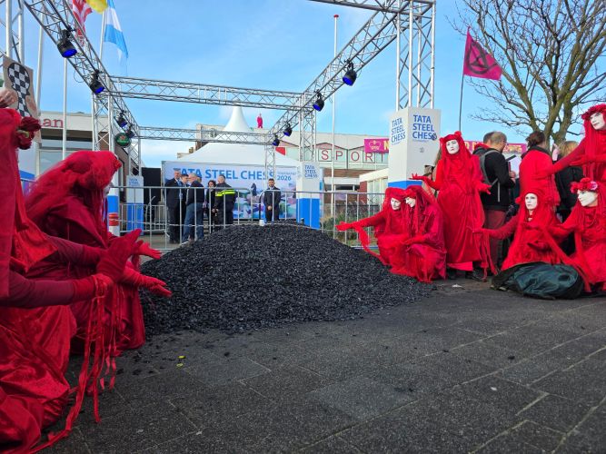 | Vandaag blokkeren we de ingang van het Tata Steel Chess Tournament in Wijk aan Zee. Rebellen storten 2025 kilo kolen, gebruiken lock-ons en hangen een banner op: No Chess on a Dead Planet. 2025 is het jaar waarin Tata Steel klimaatneutraal had moeten zijn. |