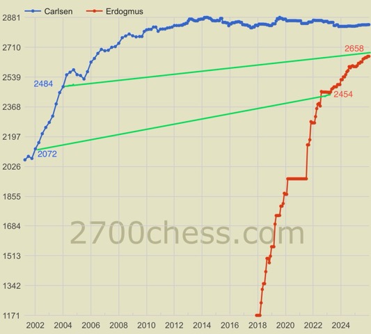 2003-2005 (Карлсеновские 12-14 лет) - это совсем другая эпоха. Даже если сравнивать не сами рейтинги, а место в рейтинге (что правильнее) - другая была эпоха.