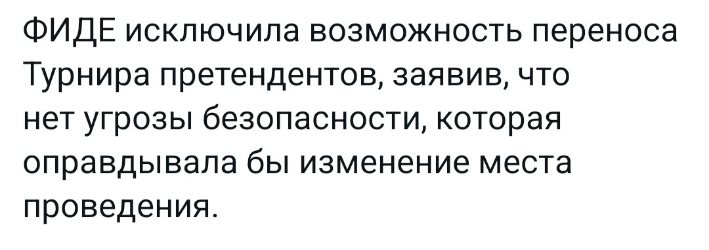 Так и тут, да, не знаю, что может сделать ФИДЕ в этом случае, переносить тоже не очень...