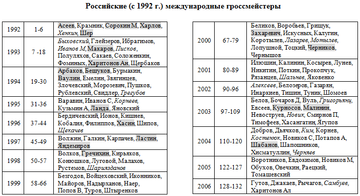 3) Текущий список российских гроссмейстеров пополнился тремя именами. Это - получившие звание А.Усков и Р.Макарян (оба числятся под флагом ФИДЕ), а также перешедший в ФШР из украинской федерации Г.Пилавов.