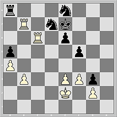 b) 36... Rh8 37. Ra7 Rh2 38. Kf1 Rh1 39. Ke2 Kd6 40. Rc2 g3!? (в случае 40... Nc5 41. Rxa5 Nfe4 42. b4 Nb3 43. Ra6 Kd5 44. f3 gxf3 45. gxf3 Rh2 46. Kd1 резвости черной конницы хватает лишь для вечного шаха) 41. Ra6 Ke7 42. fxg3 Ng4 43. Rxa5 Nde5 (не дают белых в обиду их две связанные проходные и после 43... Rg1 44. Kd3 Nde5 45. Kc3 Re1 46. Kd2! Rxe3 47. Rc3 Re4 48. Ra7 Kf6 49. b3) 44. Ra7 Kf6 45. Rc8! Rg1 46. Rf8 Kg5 47. Rg8 Ng6 48. Rag7 Rxg2 49. Ke1! (49. Kf1?? Nxe3 50. Ke1 Kg4 51. Rxg6 Kf3 с матом) 49... N4e5 50. a5 Kf6 51. a6 Nd3 52. Kf1 Rf2 53. Kg1 Nge5