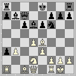 13... Nf6. Вот она - встреча-первоисточник: 13... Qe7 14. Qc2 O-O (14... h6 15. Ne5!; 14... f5!?) 15. Bxh7 Kh8 16. Bd3 c5 17. Qe2 cxd4 18. Ne5 Qh4 19. exd4 Kg8 20. f4 Nxe5 21. dxe5 Bc5 22. Be3 Be7 23. f5 Be4 24. f6 Bxd3 25. Qxd3 Rfd8 26. Qe2 Bf8 27. fxg7 Bxg7 28. Rxa3 Bxe5 29. g3 Qe4 30. Qf2 1/2-1/2, Луговой - Евсеев, Санкт-Петербург 2003. У болгарина, очевидно, по приведенной партии были свои веские соображения.