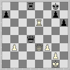 48. Qxc4! f4 49. Re5 fxe3. Пойдя 49... Re7, можно нарваться на еще большие проблемы: 50. Ra6 fxe3 51. Raxe6 Rxe6 52. Rxe6 Qf7 53. Kf1! - король неожиданно решился на заплыв за черной ныряльщицей по белым тылам, шансы на победу у белых есть. Но не 50. exf4 Qxf4 51. Rxe6 Rxd4!! 52. Qc8 (52. Rxe7 Rxc4 53. Rxc4 Qd2 ничего не меняет) 52... Qf8 53. Rxd4 (53. Qxf8 Kxf8 54. Rxe7 Rxa4! c немедленной ничьей) 53... Qxc8 54. Rxe7 Qc5 55. Red7 a5 56. R7d5 Qc3, и с полуголым королем черного ферзя не укротить.