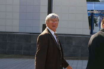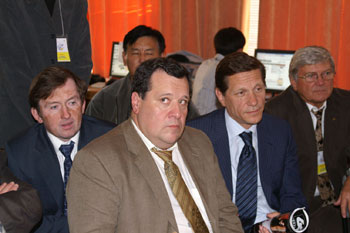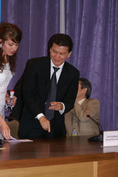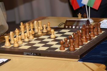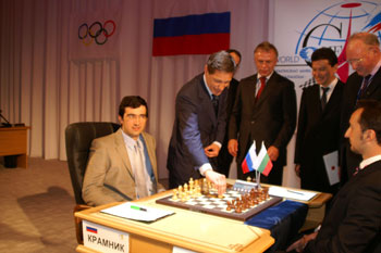 Упоминавшуюся в первом репортаже стеклянную ширму никто не стал разбирать, организаторы придумали другой ход: нас запустили на сцену и разрешили заснять волнующий момент запуска матча. Гийссен, дипломат старой школы, разумеется, не стал пускать часы: высокие гости слегка просрочили время. Но вот, толпа фоторепортеров расступилась, и высокие гости вышли на сцену. Во время зачитывания приветствий Крамник и Топалов с отсутствующими лицами сидели за шахматным столиком.