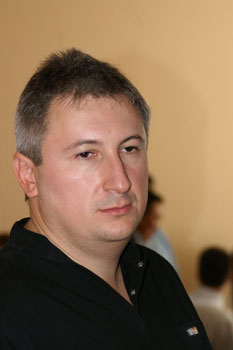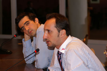 Позиция на доске тем временем претерпевала метаморфозы. Сначала она, как заметил выше Сергей Рублевский и примкнувший к нему Мигель Ильескас (тут же отомкнувший, впрочем), была хорошей. О чем свидетельствовали и наши старшие металлические братья: Рыбка, Фриц, Шреддер. Но потом все как-то заметаморфозилось… Наши братья-болгары оживились. Вы видите, как пресс- атташе Топалова Живко Гинчев (мой собрат по прическе) подошел к корреспонденту крупнейшей болгарской газеты "Труд" и говорит ему об этом с улыбкой.