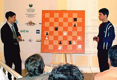 А первым, также вничью, закончился поединок Рублевский - Хайруллин. Ильдар также грамотно подготовился к отражению активности грозного соперника и добился равновесия. Причем этот поединок завершился около 18-00, то есть через три часа после начала тура! (Это специально для тех читателей, которые не могут поверить, что шахматисты борются всерьез.)