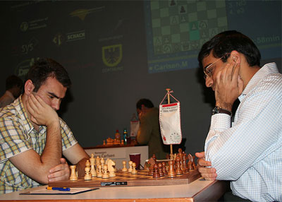 1.d4 d5 2.c4 c6 3.Nf3 Nf6 4.e3 Bf5 5.Nc3 e6 6.Nh4 Bg6 7.Nxg6 hxg6 8.Bd2 Nbd7 9.a3 Новый ход, белые хитрят. Если теперь черный слон выскочит на d6, то вполне возможно темповое с4-с5 с захватом пространства. 9...Be7 10.Qc2 Впоследствии выяснится, что это неудачное поле для ферзя. Мне кажется, более интересным профилактическое 10.h3 - и мат уже не получить, и заодно отобрать у коня поле g4. 10...0-0 11.Be2 dxc4 12.Bxc4 c5! Черные провели стандартную разгрузку в центре, позиция уравнивается. 13.dxc5 Nxc5 14.0-0 Rc8 15.Rfd1 Qc7 16.Rac1 Rfd8 Позиция уж очень напоминает партию Крамник - Ананд, сыгранную чуть раньше на турнире. 17.Be2 Nce4 18.Be1 Nxc3 19.Qxc3 Rxd1 20.Bxd1 Qxc3 21.Rxc3 Rxc3 22.Bxc3 У белых в результате минимальный плюс вырисовался, но такие позиции Ананд держит легко. 22...Ne4 23.Be1 g5 24.Kf1 b6 25.Ke2 Bf6 26.Bc2 Nd6 27.b3 Kf8 28.Bd3 Ke7 29.g4 Bb2 30.a4 f6 31.b4 e5 Черные расставились по черным полям, сделав существование на доске белопольного слона белых абсолютно бессмысленным. 32.f3 Bc1 33.Bc3 Kd8 34.b5 Ba3 35.Bd2 Ke7 36.f4 gxf4 37.exf4 exf4 38.Bxf4 g5 На доске - крепость, белым не прорваться. 39.Bxd6+ Ничья.