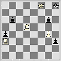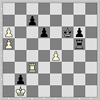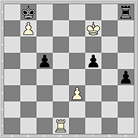 21) 1938 Ладейный эндшпиль труден для белых. Показателен вариант 1.Kg7? Re8 2.Rc1!? h3! 3.Rxc5 h2 4.Rc1 Rxe3 5.Kf6 f4 6.Kf5 (не лучше 6.Rh1 Re2 7.Kf5 f3 8.Kf4 f2 9.Kf3 Re1 ) 6...f3 7.Kf4 Rc3! 8.Rb1 f2 9.Kg4 Rb3 10.Rf1 Kxb7 . 1.e4!! fe 2.Kg7 Rh5 (2...Re8 3.Kf7 Re5 4.Kf6 Rh5 5.Kg6, и т.д.) 3.Kg6 Re5 4.Kf6 Re8 5.Kf7 Rh8 6.Kg7= Необычная картина: ладья, преследуемая королем, мечется по углам квадрата e8-h8-h5-e5 и не в силах вырваться на свободу.