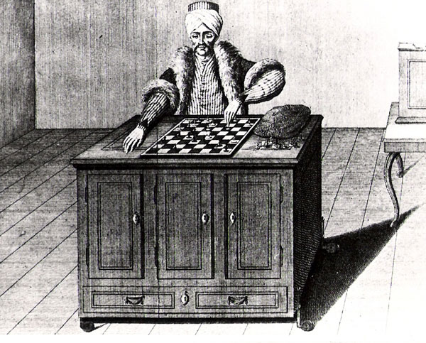 В один из февральских дней 1770 года в венский дворец Хофбург было доставлено странное сооружение. Придворные окружили таинственный предмет, пытаясь отгадать, что придумал неистощимый Кемпелен. Но вот он сдернул атласное покрывало, и все застыли в немом изумлении. Перед взорами присутствующих предстала фигура турка, облаченного в пестрый восточный наряд. Турок сидел за деревянным сундуком. Его голова, покрытая чалмой, была чуть опущена, а глаза невидящим взглядом уставилась на шахматную доску с массивными фигурами.