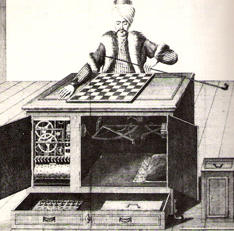 Остается добавить, что голова и глаза турка приводилась в движение другим рычагом, постукивание правой рукой - третьим, а возглас "echec!" - простым "дерганьем" веревки.