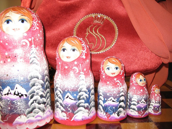Всем участницам от сестер Тихвинского монастыря достались красные сумочки с эмблемой турнира, вышитой уральскими камнями-самоцветами, и матрешки. |