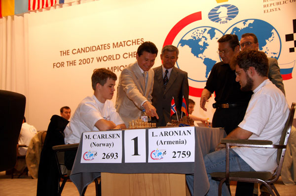 Но сначала был первый ход. На правах хозяина глава Калмыкии и президент ФИДЕ Кирсан Илюмжинов предоставил почетное право гостю Калмыкии, председателю Собрания народных представителей одного из регионов Китая. Черный наряд китайского товарища контрастировал с доминирующим на сцене белым.
