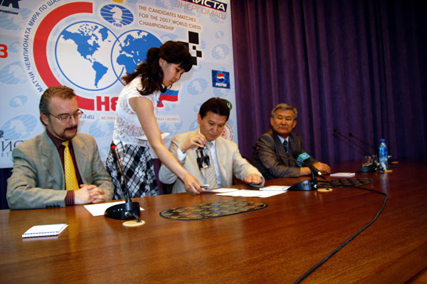 После того, как соревнованию был дан ход, пресс-секретарь президента Калмыкии Буянча Галзанов пригласил нас на пресс-конференцию своего шефа. Но сначала руководитель Калмыкии и президент Международной шахматной федерации проштемпелевал конверты. И расписался на них. Эта акция для меня лично всегда была загадочна, ибо она повторяется с завидной регулярностью на всех важнейших шахматных состязаниях. Но, видимо, так надо.