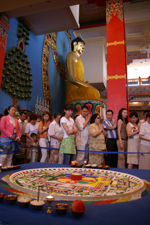 В день последнего тура в буддийском храме был совершен обряд разрушения мандалы. Этот ритуал означает слишком многое, чтобы говорить о нем вскользь. Мандалу делают из выкрашенных песчинок специально обученные монахи. Этот кропотливый труд. На строительство мандалы уходит неделя. А разрушается она довольно быстро. Все это действо для вас заснял моим фотоаппаратом международный арбитр Вячеслав Намруев. На церемонии был известный исполнитель Борис Гребенщиков. На одном из снимков БГ - в желтой майке и в очках, с длинной бородой.