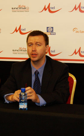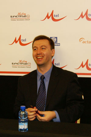 А вот другой участник матчей претендентов в Элисте, Майкл Адамс после партии с Топаловым был слегка растерян. Позиция была у белых, которыми он руководил, настолько хорошая, что казалось, вот-вот карточный домик из слонов и ладей, который выстроил Веселин, должен был рухнуть. Но он каким-то непонятным образом держался! Майкл пришел на пресс-конференцию в одиночестве, Топалова, как обычно, терзало местное телевидение. И пока он ждал партнера, я его отснял по полной программе. (Фотографии, где Микки с открытым ртом - у него специфическая манера говорить, поэтому он на снимках часто выглядит не здорово - я опускаю.)