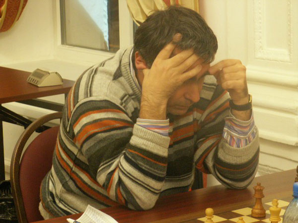 Алексеев – Камский. Гата продолжает убегать от теории, которую не знает и знать не желает. От Алексеева убежал удачно: 1.d4 d5 2.Nf3 Nf6 3.c4 c6 4.Nc3 a6 5.c5 Bf5 6.Bf4 Nbd7 7.e3, и вместо набившего оскомину 7...e6 – вдруг 7...g6!? После 8.h3 Bg7 9.Be2 Be4 выяснилась идея черных. На 10.0-0 Камский собирался играть просто 10...Bxf3 11.Bxf3 0-0, затем черные быстро-быстро проводят е7-е5. Алексеев ответил профилактическим 10.Nh4, однако недооценил 10...e5! 11.de Nh5. Начиная с этого момента и до конца партии, на победу будут играть только черные. 12.Nf3 Bxf3 13.Bxf3 Nxf4 14.ef Nxc5 15.0-0 0-0 16.Re1. Первый важный момент. Его показал Камский. Черные сыграли 16...Kh8. Ненужная профилактика обернулась потерей темпа. Надо было сразу играть 16...f6! Гате не понравился ответ 17.e6 Re8 18.b4, мерещились миражи типа 18...Nxe6 19.Nxd5 cd 20.Bxd5 Qb6 21.f5 gf 22.Qe2 Kf7 23.Qh5+ и т.д. Но вместо 19...cd намного сильнее 19...f5! У черных фактически лишняя пешка, да и легкие фигуры превосходят оппонентов в активности. Второй важный момент показал Алексеев. 17.g3 f6 18.Bg4 Qb6 19.Qd4 Rae8 20.Rad1 a5 21.a3 fe 22.fe h5 23.b4 ab 24.ab Na4 25.Nxa4 Qxd4 26.Rxd4 Rxe5 27.Rxe5 Bxe5 28.Rd1 hg 29.hg Ra8 30.Nc5 Bc3 31.Rb1 b6 32.Nd3 Kg7 33.Kg2 g5 34.Kf3. Оказывается, черные... вправе поиграть на мат! При столь малом количестве фигур матовая сеть, тем не менее, угадывается без труда. Для начала надо было сделать ход 34...Bd4! Крайне важно, как подчеркнул Женя, взять под контроль поле d4. Дальнейшее просто: ладья прямоугольным зигзагом перемещается на d2, пешка с6 маршем доходит до с4, отбрасывается конь и... всё. Мат. Радикальной защиты от этого плана Алексеев и Камский во время пребывания у демонстрационной доски так и не нашли. 34...Ra3 35.Ke3 (скорей на поле е3, пока не отняли!) 35...Kf6 36.f4 Ra8 37.Rh1 Re8+ 38.Kf3 Bd4 39.fg+ Kxg5. Ничья по предложению Камского.