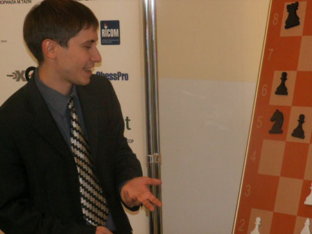 Очень забавный был у них диалог на самых первых минутах. Когда ставили ходы 1.e4 g6 2.d4 Bg7 3.Nc3 c6 4.h3 d6 5.Be3 Nd7 6.Nf3 Qa5, Камский говорит: - Слушай, а хорошая идея - 7.Nd2 пойти?! Леко говорит: - О'кей, хорошая, но зачем? Камский уверенно говорит: - На с4 коня перевести. А Леко снова говорит: - О'кей, но зачем? Этого Камский объяснить не смог. На выходе из пресс-центра я догнал Петера. Всего один вопрос: - Петер, у Вас уже очень крепкий русский язык, но почему Вы каждую фразу начинаете со слова "О'кей"? - Автоматичке, - моментально отвечает Леко. И затем (видимо, не будучи уверен, что сказал правильное слово), добавляет: - Рефлекс...