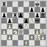 29...Bxc2+ 30.Kc1 f5 31.Nxe7+ Qxe7 32.Qh8+ Kf7 33.Rh7+ Kg6 34.Rh6+ Kf7 35.Qh7+ Ke8 36.Qg6+ Rf7 37.Qc6+ Qd7 38.Re6+ Kf8 39.Qa8+ Kg7 40.Rh1! Rf8 41.Rg6+ Kxg6 42.Qxf8+- В партии последовало 24...g6 25.Nd5!+- Изящное решение. Выигрывало и 25.Bxc4 Bxc4 26.Ne4 Qxe5 27.Qxe5 Rxe5 28.Nf6+ Kh8 29.Nd7 Ree8 30.Nxf8 Rxf8 31.Rxd4+- 25...Qxd5 26.Bxc4 Qxc4 27.Qf6 1–0 г) Учитывая вышесказанное, в распоряжении чёрных остаётся единственная возможность 23...Qe3 24.Qh4 Rc7 25.h6 g6 26.Rhe1 Qf3. Позиция белых перспективнее, но вся борьба ещё впереди. Именно это решение мне представляется сильнейшим в исходной позиции. Павел Эльянов - Гата Камский