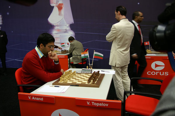 Ананд сидел за столом. А Топалов прогуливался по сцене, его как бы игнорировал.